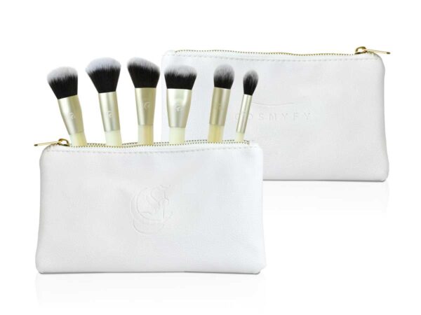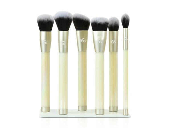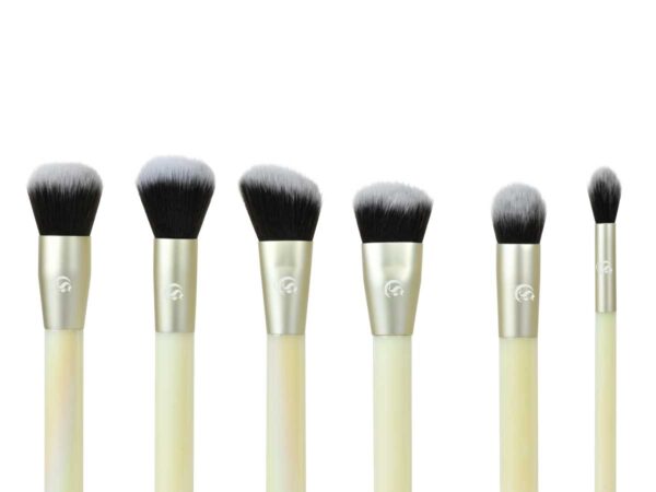 Il set comprende: un pennello morbido da cipria, un pennello più denso da fondotinta, un pennello angolato da Bronzer, un pennello tondeggiante da blush, un pennello tondeggiante piccolo per il contouring naso, un pennello a setole affusolate per illuminare o applicare la cipria sotto il contorno occhi.